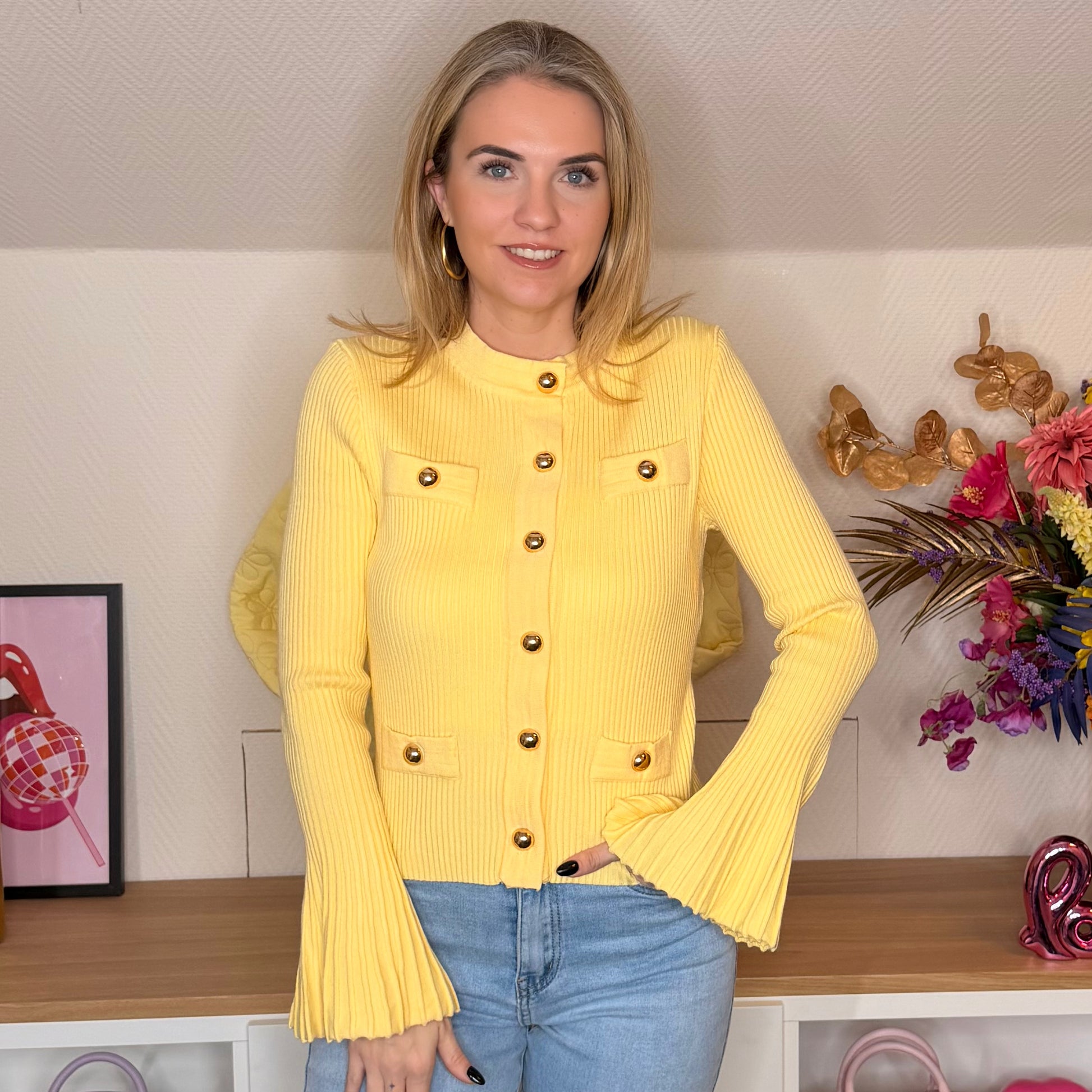Deze fijngebreide top in een gele tint heeft een elegante uitstraling dankzij de gouden knopen en subtiele borstzakjes. De licht uitlopende mouwen geven een vrouwelijke touch. Mooi te combineren met een jeans of nette broek.